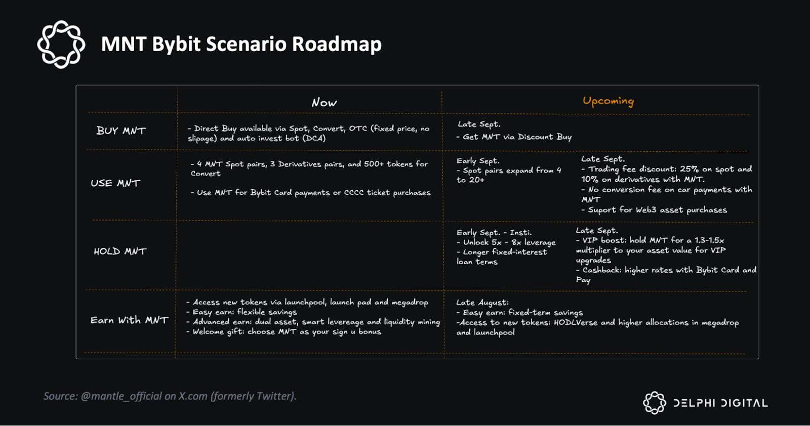 29 августа биржа Bybit и Mantle представили совместную дорожную карту, которая предоставляет держателям MNT возможность покупки с меньшим проскальзыванием, больше вариантов оплаты в экосистеме Bybit и другие продукты для сбережений и стейкинга. Источник: Delphi Digital