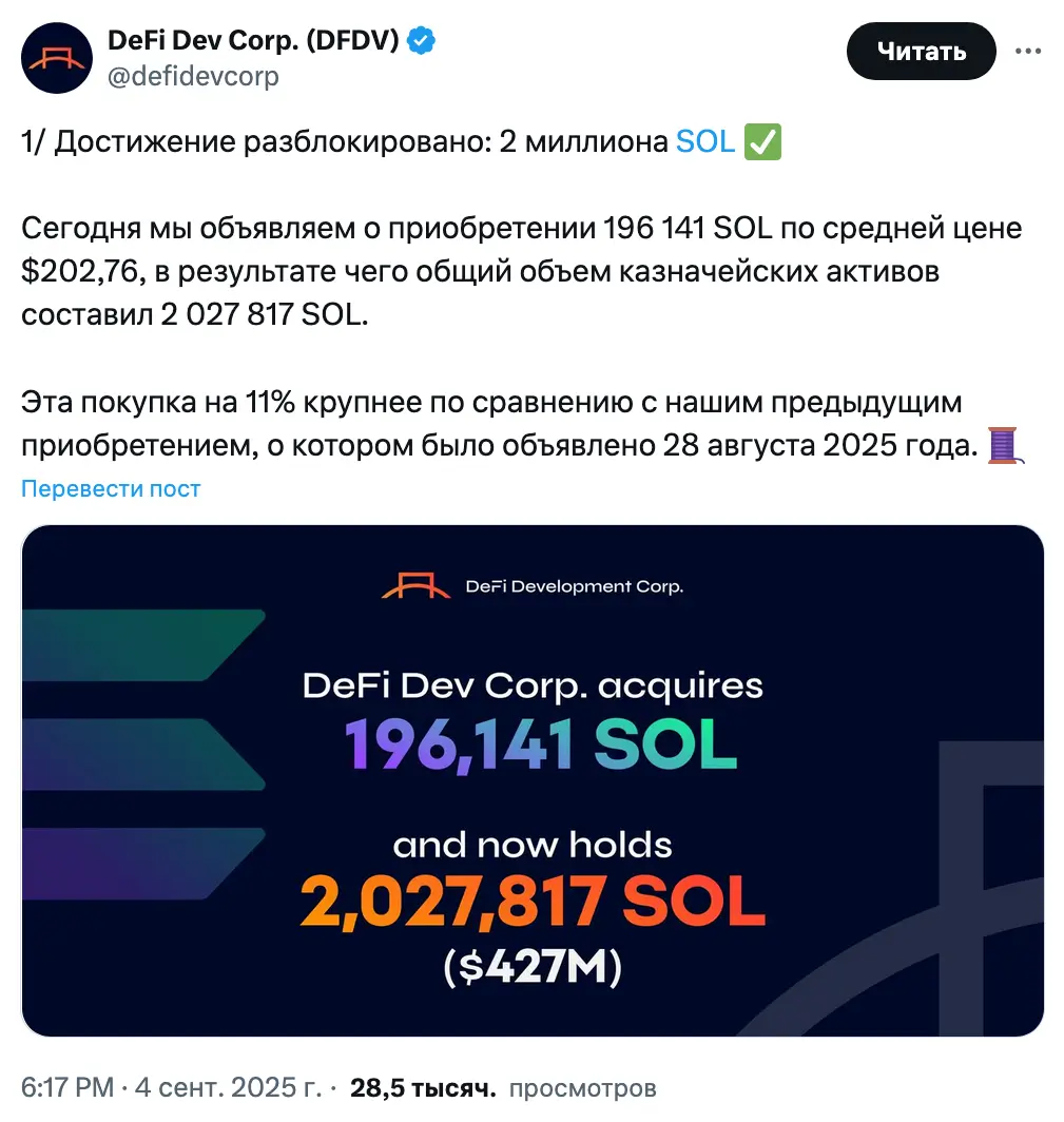 После последнего приобретения казначейство DeFi Development Corp владеет более чем 2,02 млн SOL на сумму около $412 млн, что вдвое превышает сумму, имевшуюся на 21 июля.