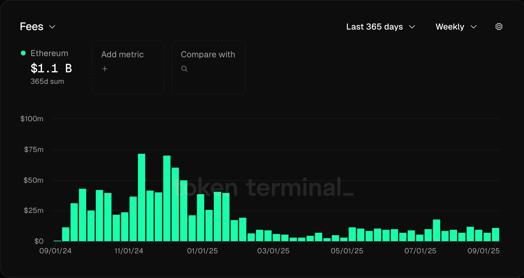 По данным Token Terminal, за последний календарный год Ethereum собрал комиссий на сумму 1,1 миллиарда долларов. Однако с февраля сумма собранных комиссий резко упала.
