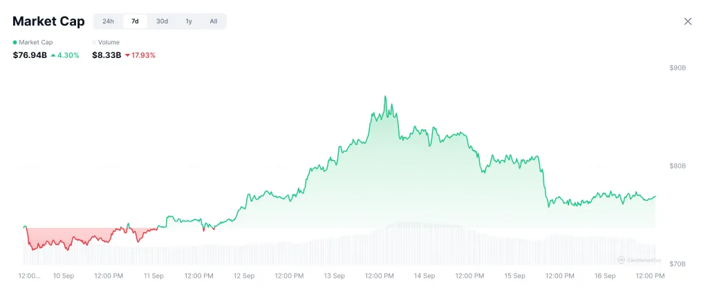 Всплеск активности произошел на фоне роста капитализации сектора «смешных монет», которая приблизилась к $77 млрд. За последнюю неделю показатель вырос на 4,3%, а за месяц — почти на 10%.