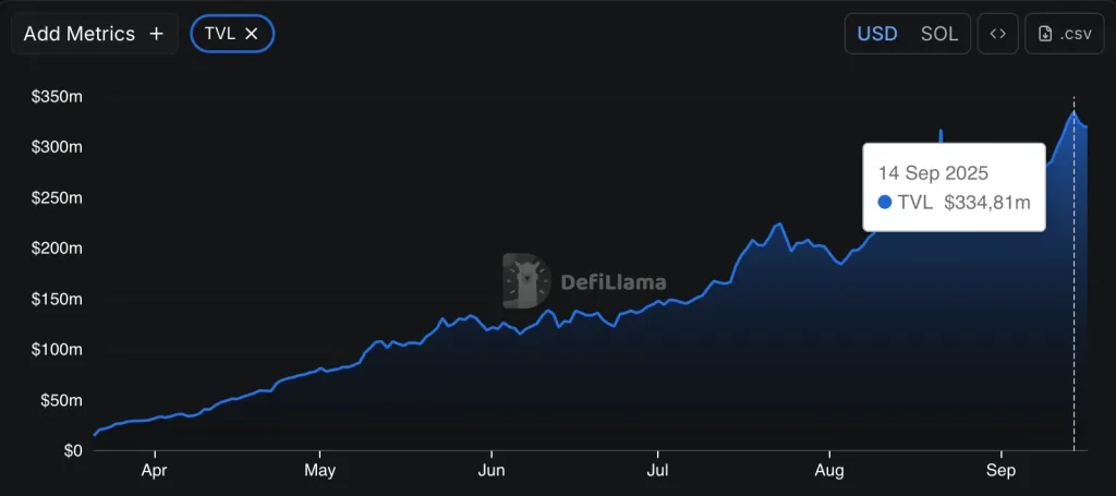Ключевые показатели Pump.fun устойчиво растут. 14 сентября TVL платформы достиг исторического максимума на уровне $334 млн. На момент написания в протоколе заблокировано $320 млн.
