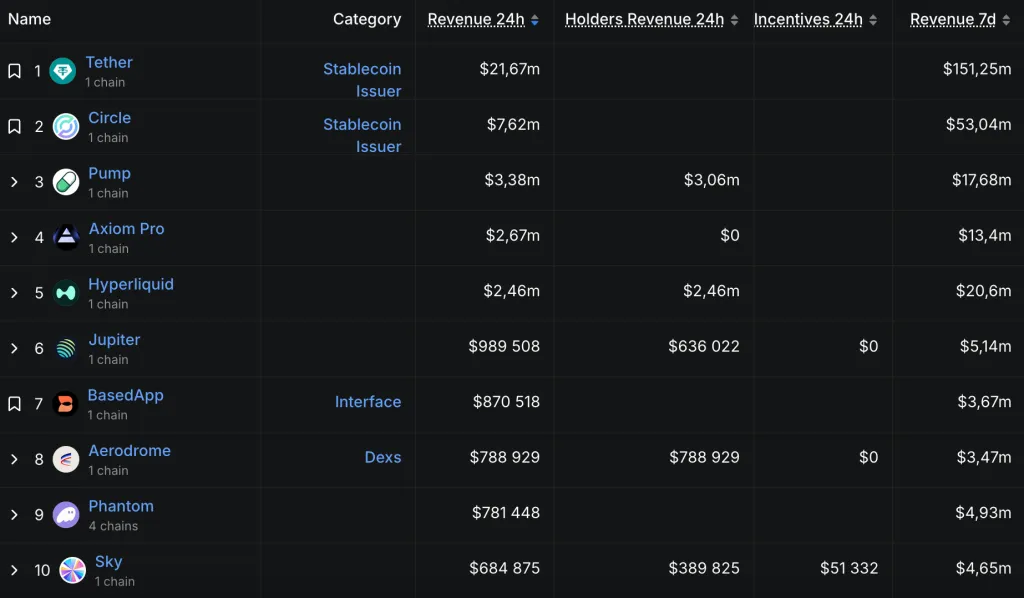 Платформа для генерации мем-коинов также превзошла по суточной выручке биржу Hyperliquid — $3,38 млн против $3,06 млн. Pump.fun заняла третье место по этому показателю среди всех DeFi-протоколов, уступая только эмитентам стейблкоинов Circle и Tether.