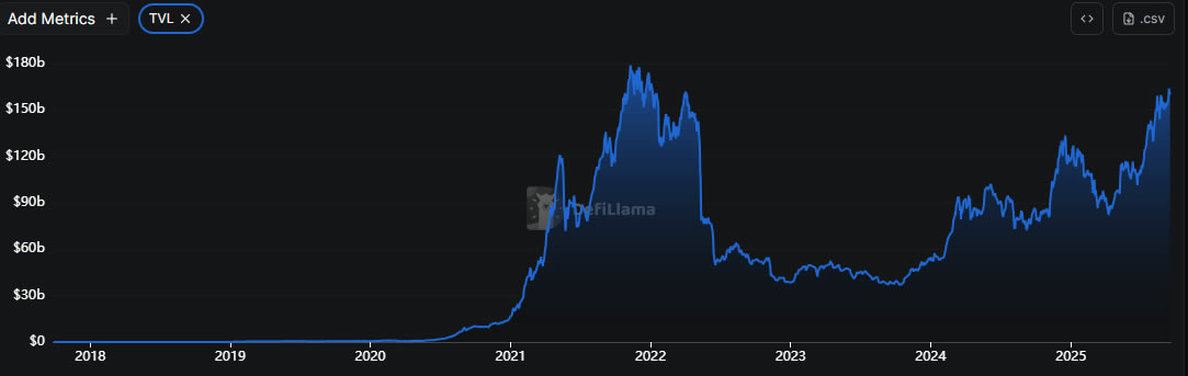 Общая стоимость заблокированных средств (TVL) в DeFi приближается к историческим максимумам, но остается относительно небольшой. По данным DefiLlama, этот показатель составляет $160 млрд, что меньше рыночной капитализации Boeing.