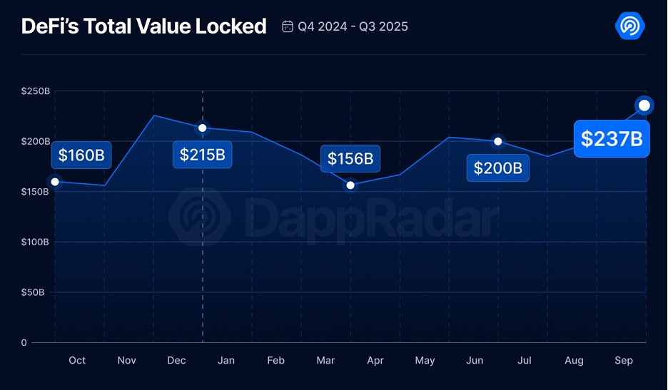 DappRadar сообщил, что среднее количество активных транзакций в кошельках в день в третьем квартале составило 18,7 млн, что на 22,4% меньше, чем во втором квартале. В то же время протоколы DeFi в совокупности заблокировали $237 млрд, что является самым высоким показателем общей заблокированной стоимости в истории отрасли.