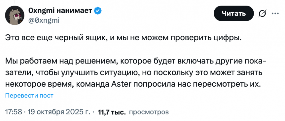 В ответ на публикацию 0xngmi заявил, что команда все еще не может проверить цифры, назвав их черным ящиком. Он добавил, что пока DefiLlama разрабатывает новую систему с большим количеством метрик, команда Aster запросила повторный листинг.