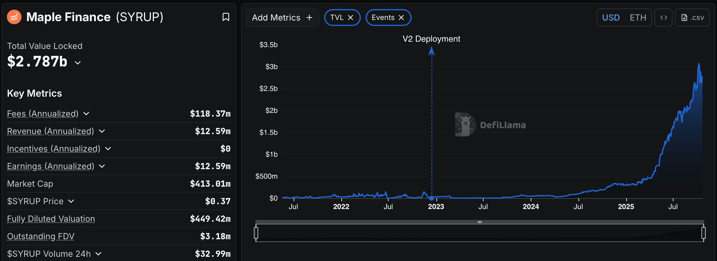 Maple Finance следует этой тенденции. Согласно данным ончейн, протокол нарастил общую заблокированную стоимость (TVL) до $2,78 млрд с $296,9 млн на 1 января 2025 года.