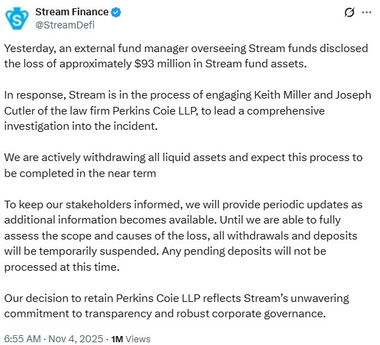 Децентрализованная финансовая платформа Stream Finance объявила о временной приостановке депозитов и вывода средств. Причиной стало уведомление от внешнего управляющего фондом, контролирующего активы проекта: убытки составили $93 млн.