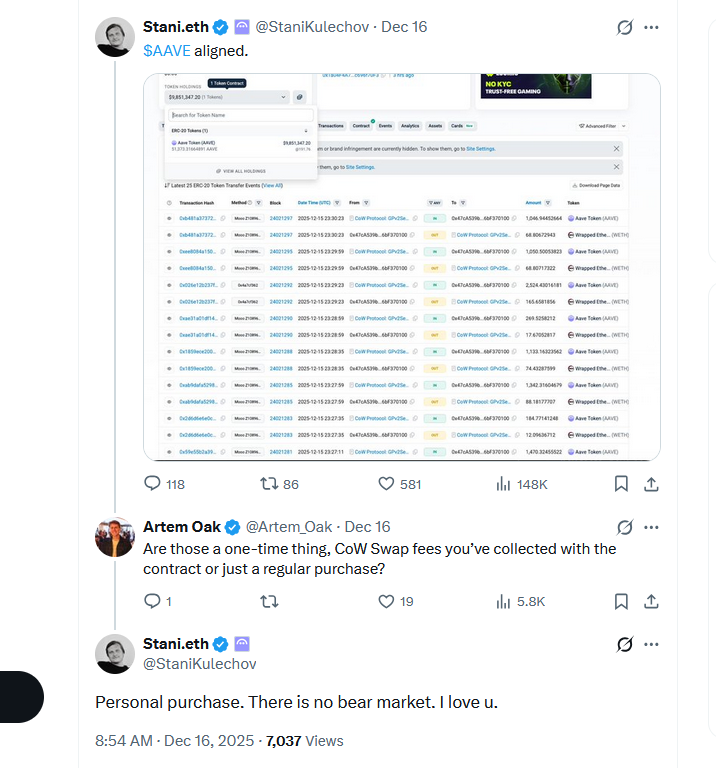 Наряду с объявлением SEC и генерального плана, Кулехов ограничил ситуацию во вторник, сообщив, что он лично приобрел AAVE на сумму 9,8 миллиона долларов, помимо предлагаемой Aave DAO программы обратного выкупа.