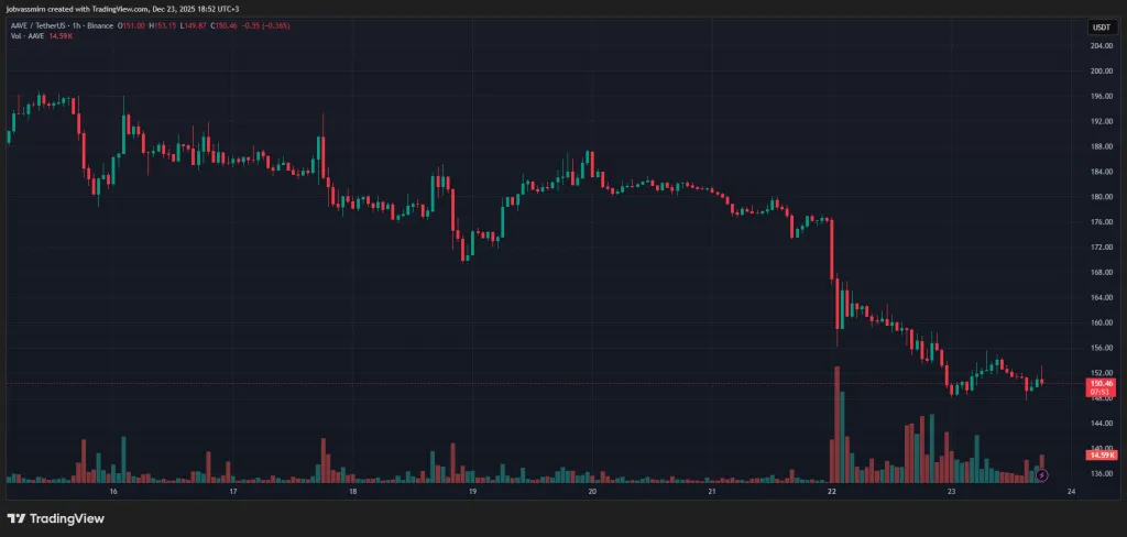 За прошедшие семь дней нативный токен лендинговой платформы Aave (AAVE) просел на 19%, продемонстрировав худшую динамику среди 100 крупнейших активов.