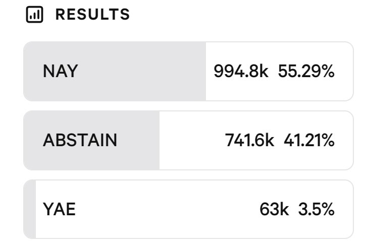 В пятницу опрос в Snapshot завершился следующими результатами: 55,29% проголосовали «против», 41,21% воздержались. Лишь 3,5% участников поддержали предложение.