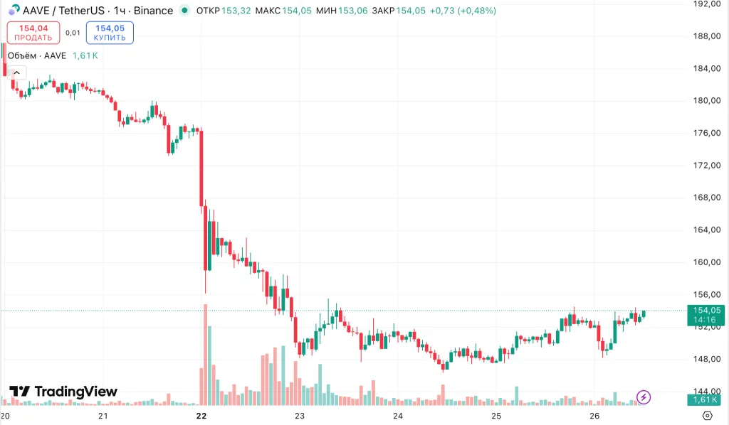На фоне «гражданской войны» AAVE потерял 19% за неделю, опустившись до ~$150. К моменту написания актив немного восстановился и сейчас торгуется около $154.
