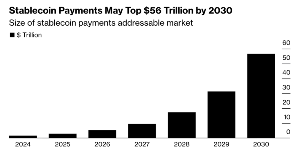 По прогнозам аналитиков Bloomberg Intelligence, общий объем сегмента стейблкоинов может достичь $56 трлн к 2030 году.