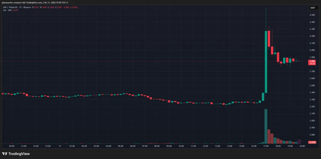 На фоне новости курс $UNI подскочил на 14% за сутки. Актив подорожал примерно с $3,2 до $3,8, на короткое время преодолев уровень в $4.