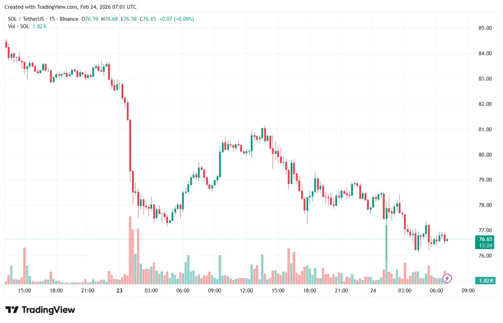 Курс монеты $SOL также снизился до $76,65 — на 74% ниже исторического максимума.