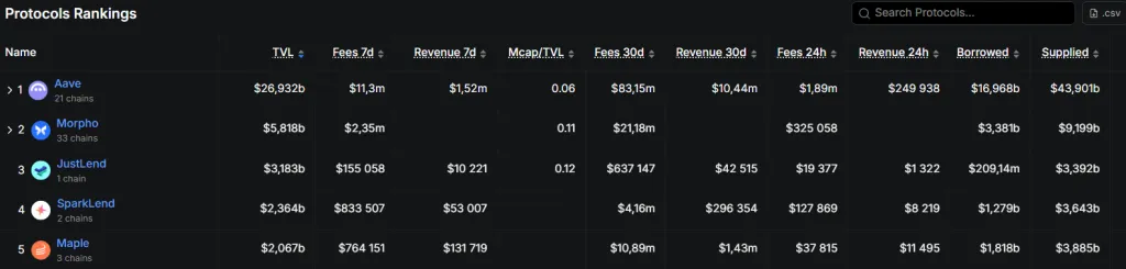 Aave уверенно лидирует среди лендинговых платформ. Общий объем заблокированной стоимости в протоколе превышает $26,9 млрд.
