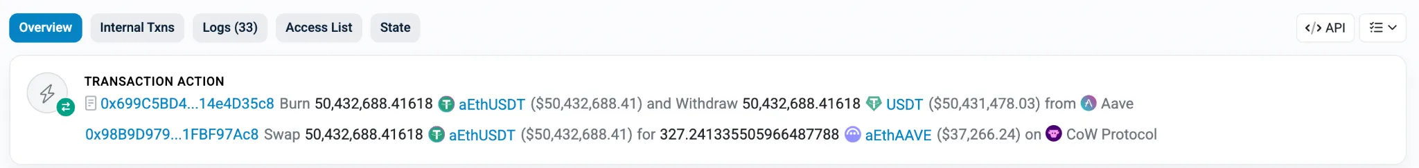 Неизвестный инвестор попытался обменять 50,43 млн $USDT на $AAVE через агрегатор CoW Protocol и биржу SushiSwap. В итоге он получил только 327 токенов стоимостью около $36 000.