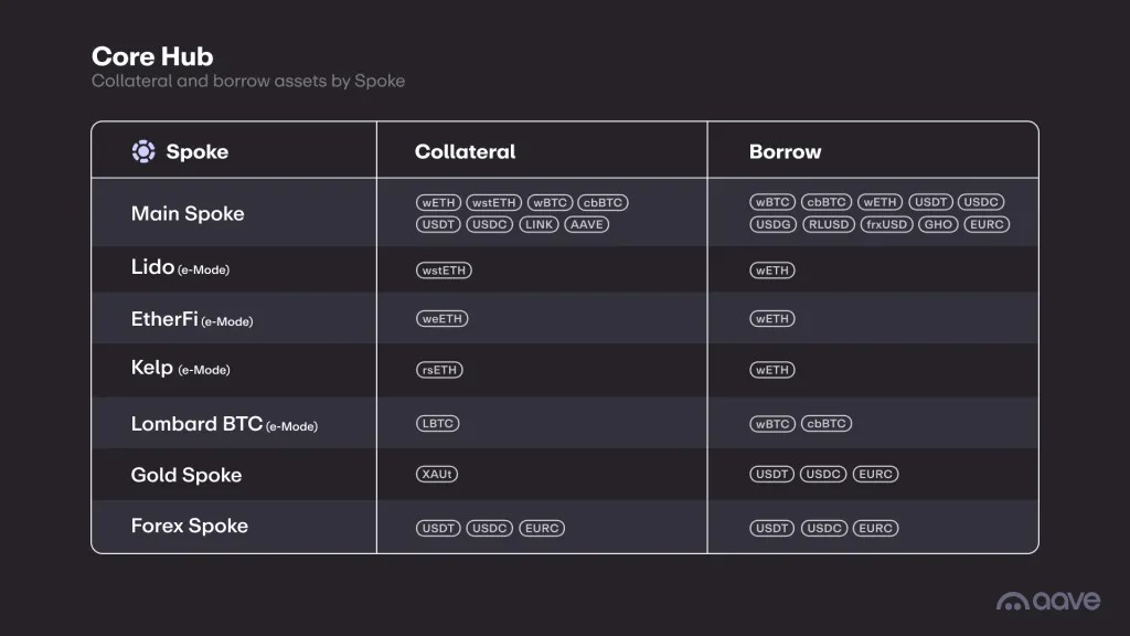 Главное нововведение обновления — архитектура Hub and Spoke. Теперь активы хранятся в центральных хабах (Liquidity Hubs). К ним подключаются ответвления (Spokes) с индивидуальными правилами обеспечения, рисками и механизмами ликвидации.