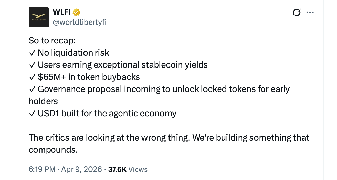 Ранее депозиты включали примерно 1,99 миллиарда токенов $WLFI. В настоящее время эта позиция составляет более половины всех предоставленных активов Dolomite, общая заблокированная стоимость которых оценивается в 825–836 миллионов долларов. 9 апреля 2026 года официальный аккаунт $WLFI в X опубликовал ветку, посвященную тому, что он назвал «FUD» сообщества. Проект заявил, что он далек от ликвидации, и утверждал, что его роль в качестве якорного заемщика приносит доход, который делает протокол привлекательным для всех вкладчиков.