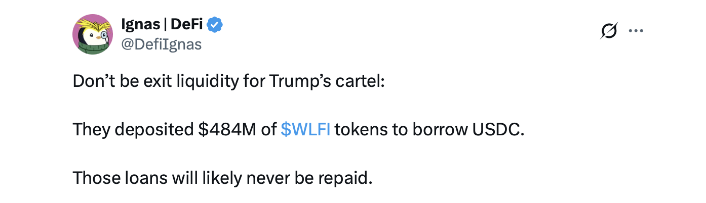 DeFi-проект, поддерживаемый семьей Трампа, предоставил в качестве залога примерно 5 миллиардов токенов управления $WLFI, номинальная стоимость которых составляет от 440 до 460 миллионов долларов, чтобы занять примерно 65,4 миллиона долларов в $USD1 и 10,3 миллиона долларов в USDC. Данные ончейна показывают, что более 40 миллионов долларов из этих заемных средств впоследствии были переведены на Coinbase Prime. Наблюдатели отнеслись к этому явно прохладно.