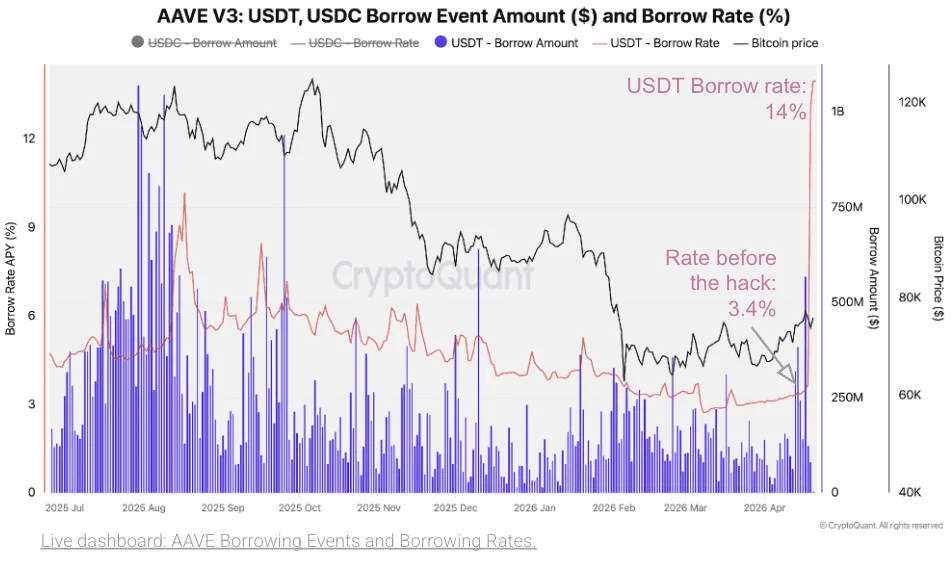 Ставки по кредитам на трех крупнейших рынках Aave сразу же отразили это давление. Данные Cryptoquant показывают, что ставки по кредитам в $USDT и $USDC на Aave V3 подскочили с 3,4% до 14%, поскольку пользователи поспешили занять стейблкоины и выйти из протокола. До взлома эти ставки держались на уровне 3,4%, что соответствовало обычным условиям кредитования в DeFi.