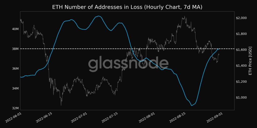 В связи с этим количество убыточных Ethereum-адресов достигло нового месячного максимума, основанного на семидневной скользящей средней на уровне 38 001 366 по состоянию на 30 августа. Таковы данные аналитической платформы Glassnode.