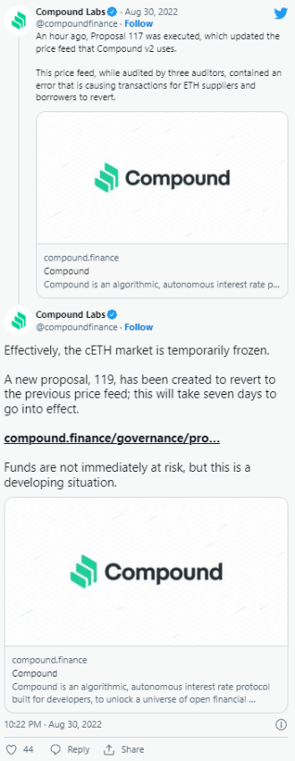 Недавно появилась информация о том, что Compound Labs приостановила торговлю Compound Ether (cETH) из-за бага в «предложении 117». Ошибка привела к отмене транзакций для поставщиков и заемщиков ETH. «Предложение 117» заключалось в установлении нового ценового оракула по инициативе GFX Labs.