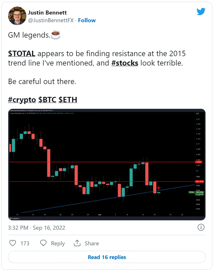 Что еще добавил аналитик? Беннетт также обратил внимание на общую капитализацию крипторынка (TOTAL). Он также предупредил, что этот показатель может столкнуться с восходящим сопротивлением. Сейчас линия TOTAL находится на уровнях 2015 года и составляет 1,004 млрд долларов, снизившись на 7,9% на неделю.