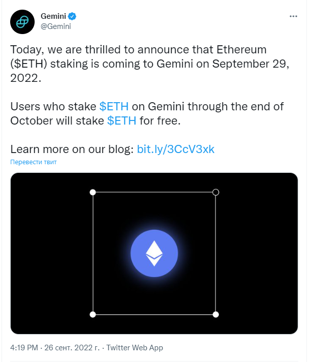 Популярные криптобиржи планирует запустить на своей платформе стейкинг Ethereum. В частности, торговая платформа Gemini объявила о подобных планах и начале стейкинга с 29 сентября 2022 года.