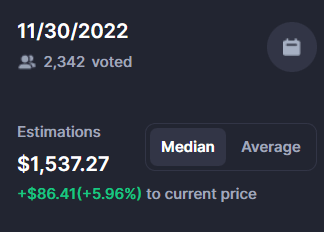 Подсчёт голосов демонстрирует уверенность криптосообщества в том, что 30 ноября 2022 года Ethereum будет торговаться по средней цене $ 1537, за эту цифру отдано 2342 голосов.