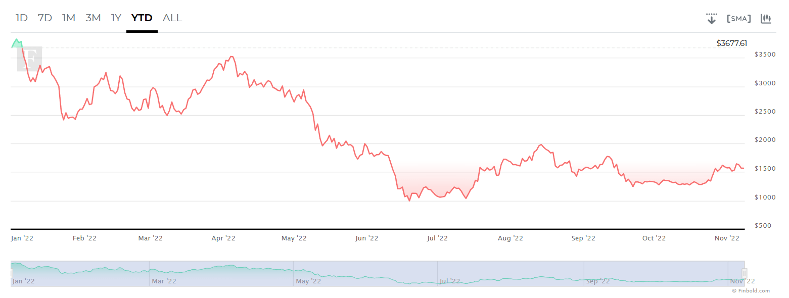 Вечером 8 ноября Ethereum снизился до отметки $ 1350, снизившись на 14,70% за день и на 13,7% за неделю. С начала года эфир преимущественно следовал общему медвежьему тренду, торгуясь в основном в боковом тренде в течение многих месяцев.