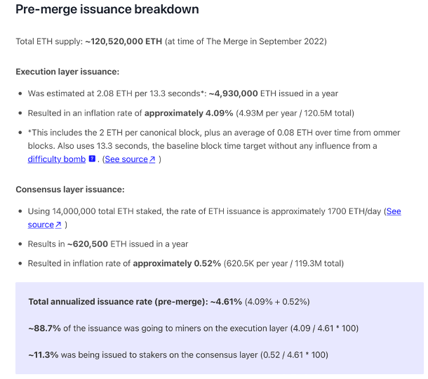 До перехода Ethereum на PoS количество выпускаемых в день токенов рассчитывалось по формуле: (1) Вознаграждение за блок для майнеров + (2) Вознаграждение для PoS-стейкеров – (3) Сожженные токены.
