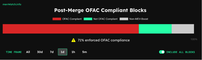 Другой серьезной проблемой является цензура. По данным MEV Watch, некоторые ретрансляторы MEV-Boost регулируются Управлением по контролю за иностранными активами (OFAC) и могут цензурировать определенные транзакции. Это противоречит самой концепции децентрализации.