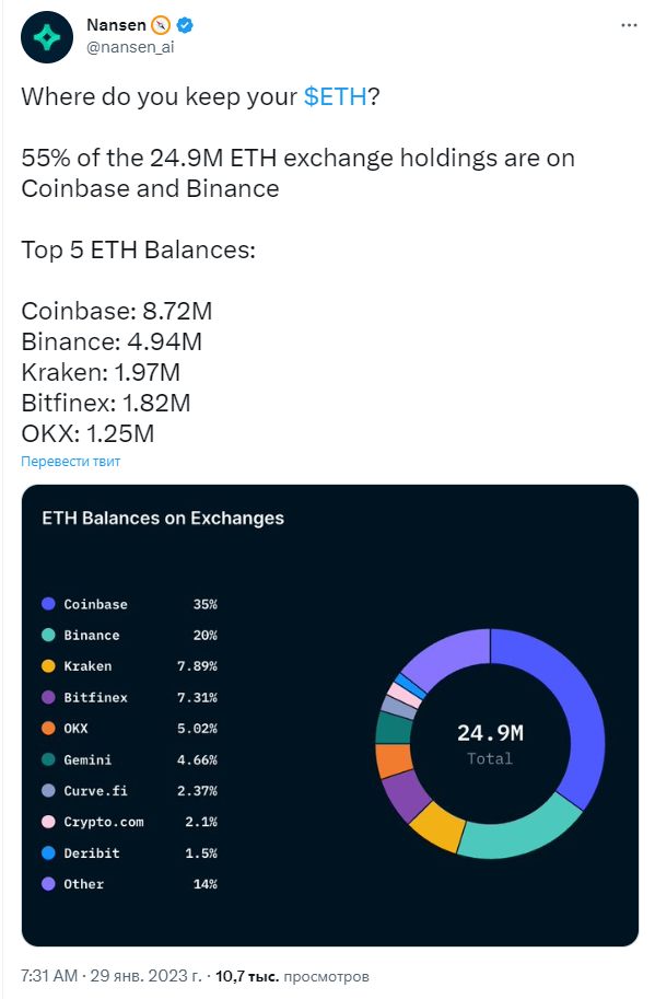 По данным аналитической платформы Nansen, 55% Ethereum (ETH) хранятся на криптобиржах Coinbase и Binance.