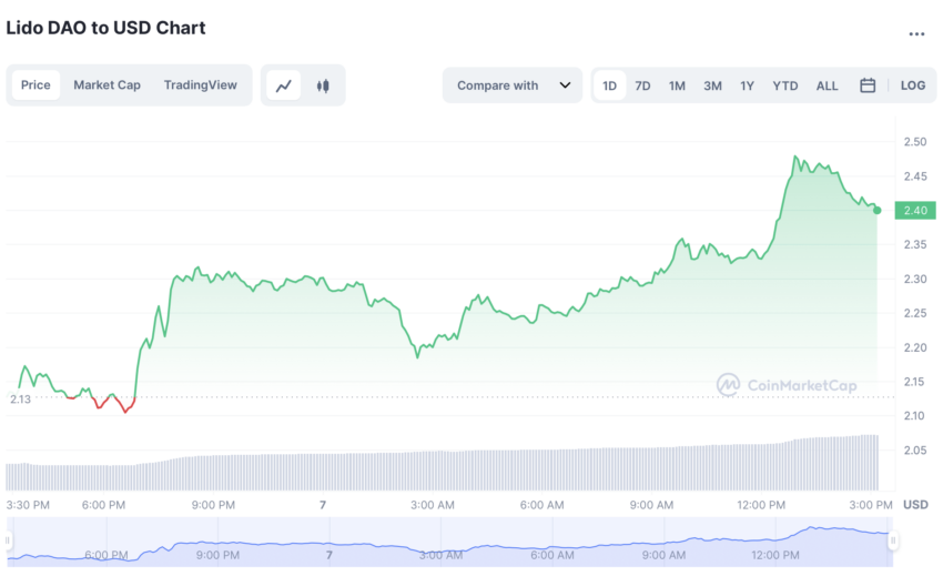 По данным CoinMarketCap, за последние 24 часа нативный токен платформы LDO подорожал на 12%. На момент публикации он торгуется на уровне $2,4.