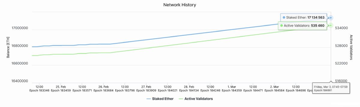 Количество валидаторов в сети Ethereum и число монет на стейкинге