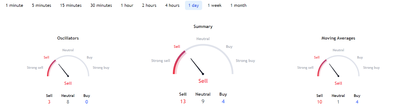 Между тем, настроения по однодневным индикаторам, полученным с сайта отслеживания финансов и криптовалют TradingView, в целом медвежьи, предлагая «продавать» на уровне 13, с осцилляторами, указывающими на «продажу» на уровне 3, и скользящими средними в зоне «продажи» на уровне 10.