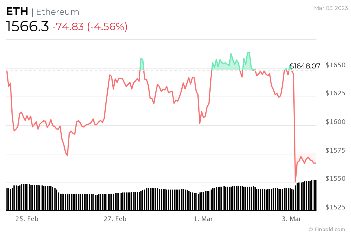 Как и остальная часть крипторынка, в настоящее время Ethereum переживает падение цен до $1566, показывая дневные потери в размере 4,56%.