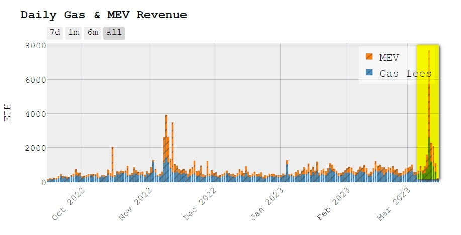 Прибыль валидаторов Ethereum от «максимально извлекаемой стоимости» (MEV) достигла рекордных значений на фоне депега USD Coin (USDC) и краха SBV.