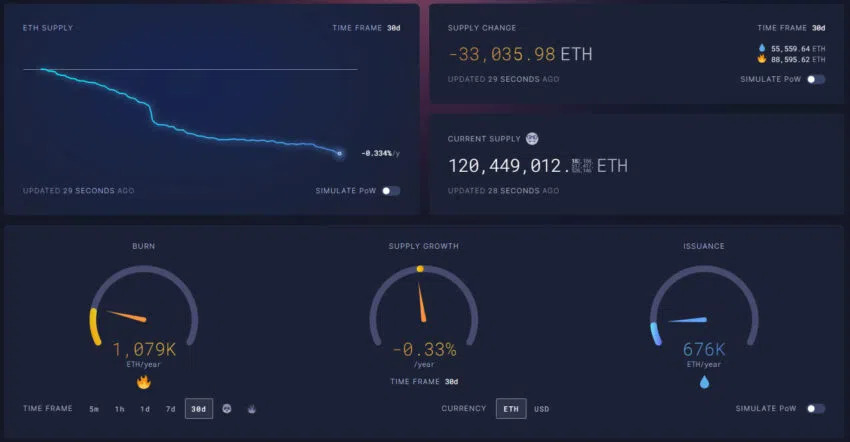 Предложение Ethereum сокращается самыми быстрыми темпами в истории: согласно данным трекера Ultrasound.Money, рост предложения ETH за последний месяц составил -0,33%.