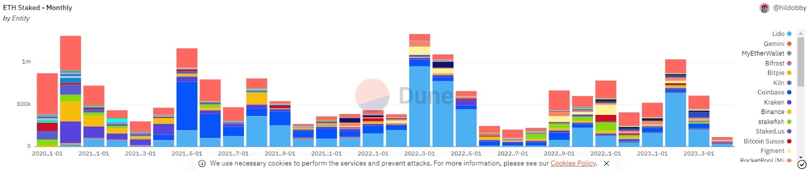 Deposit trends by staking providers have exhibited a clear shift over time with Kraken, Binance and Coinbase jousting for deposit allocations across the Beacon Chain's early days.