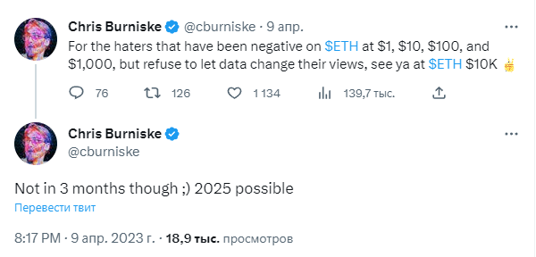 Судя по ответам на этот пост, немалое количество людей из криптосообщества склонны согласиться с Берниске. Отдельные оптимистично настроенные фанаты ETH и вовсе считают, что альткоин может достичь $ 10 000 уже в 2023 году.