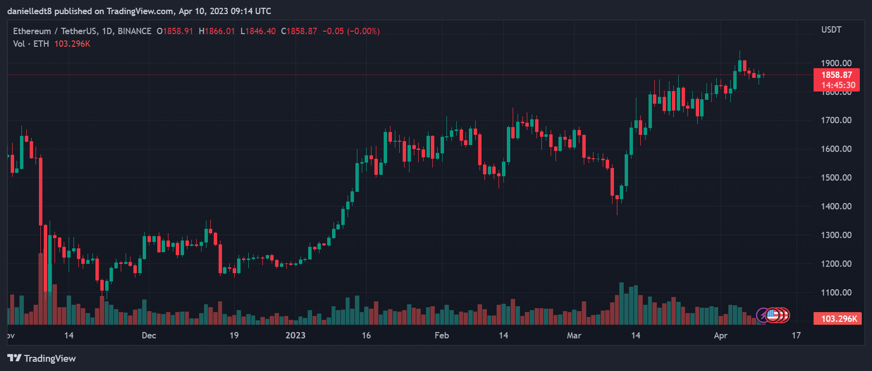 Вечером 10 апреля эфириум торговался по цене $ 1896, показав суточный рост в размере 2,2%. За неделю стоимость альткоина вышла в плюс на 4,7%.