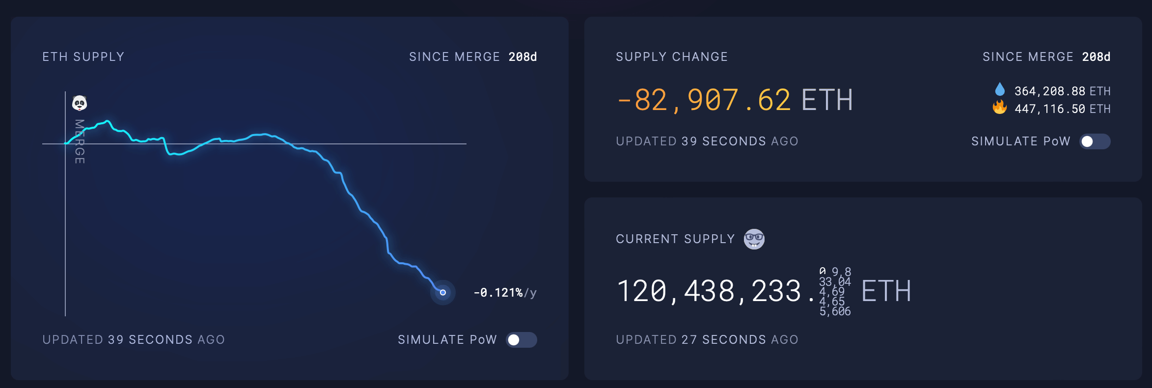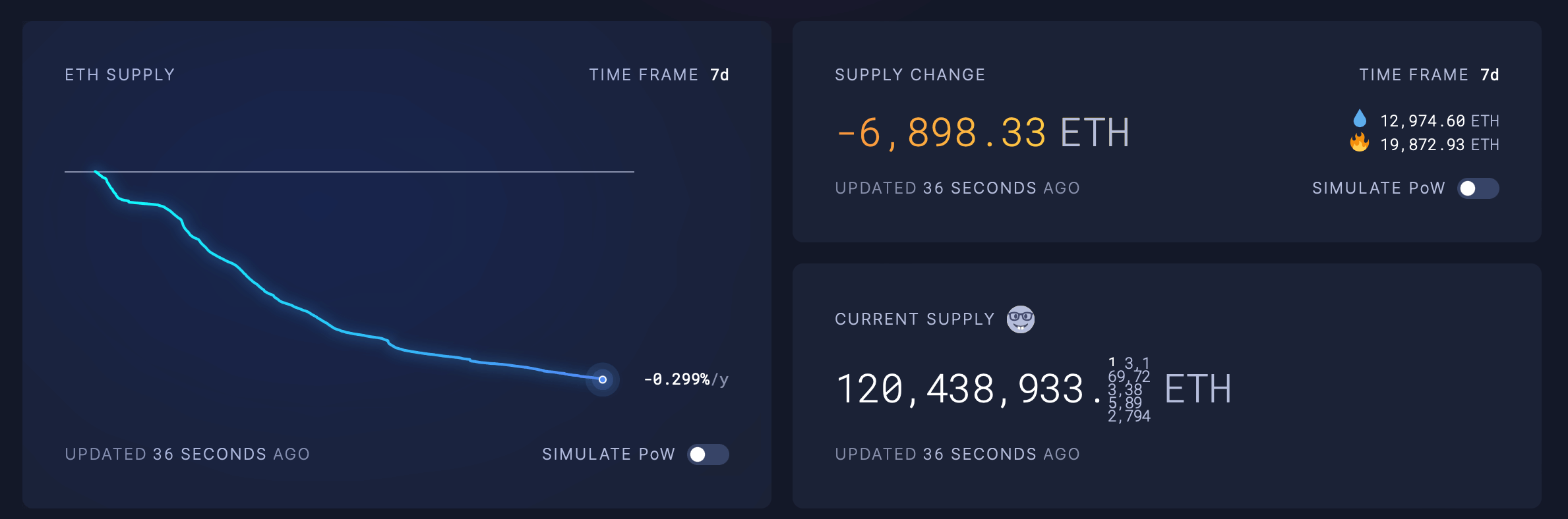 Симуляция изменения количества эфиров ETH в обороте с момента перехода блокчейна на PoS, если бы блокчейн и дальше работал на PoW