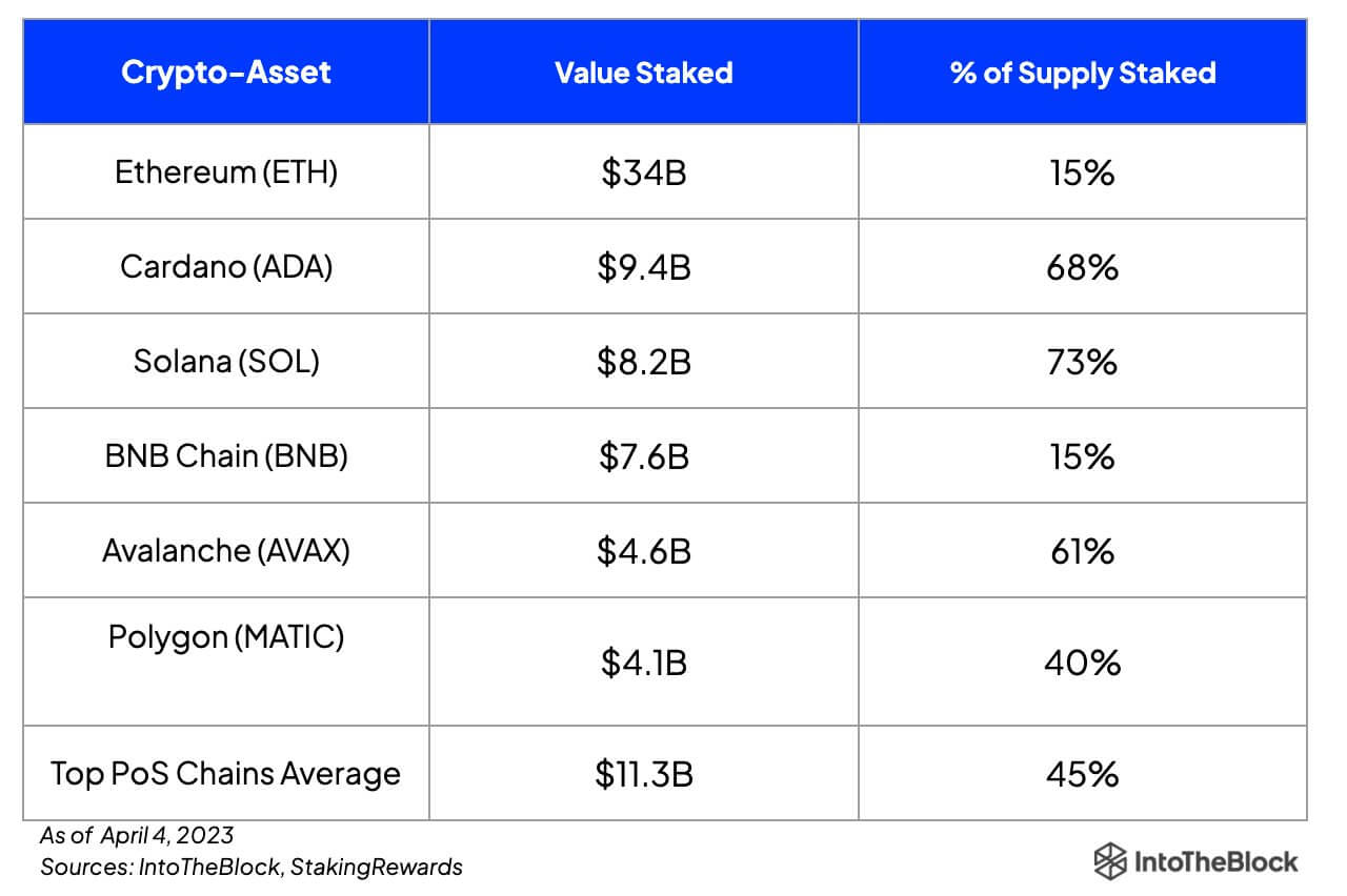 Для наглядности приведём статистику от начала апреля 2023 года. Здесь указано, какой процент от общего предложения разных криптовалют находится в стейкинге.