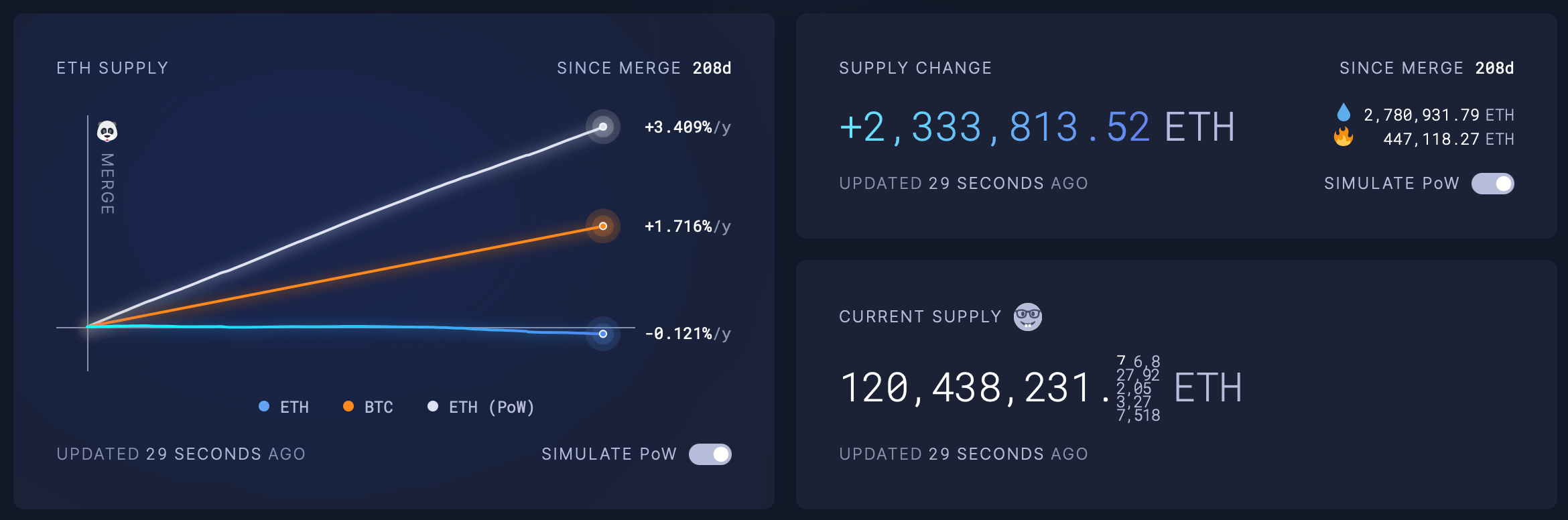 Забавно, что если бы блокчейн продолжил работать на алгоритме консенсуса PoW с его высокой эмиссией за этот же период общее предложение криптовалюты увеличилось бы более чем на 2.3 миллиона монет. Вот соответствующая симуляция ситуации.
