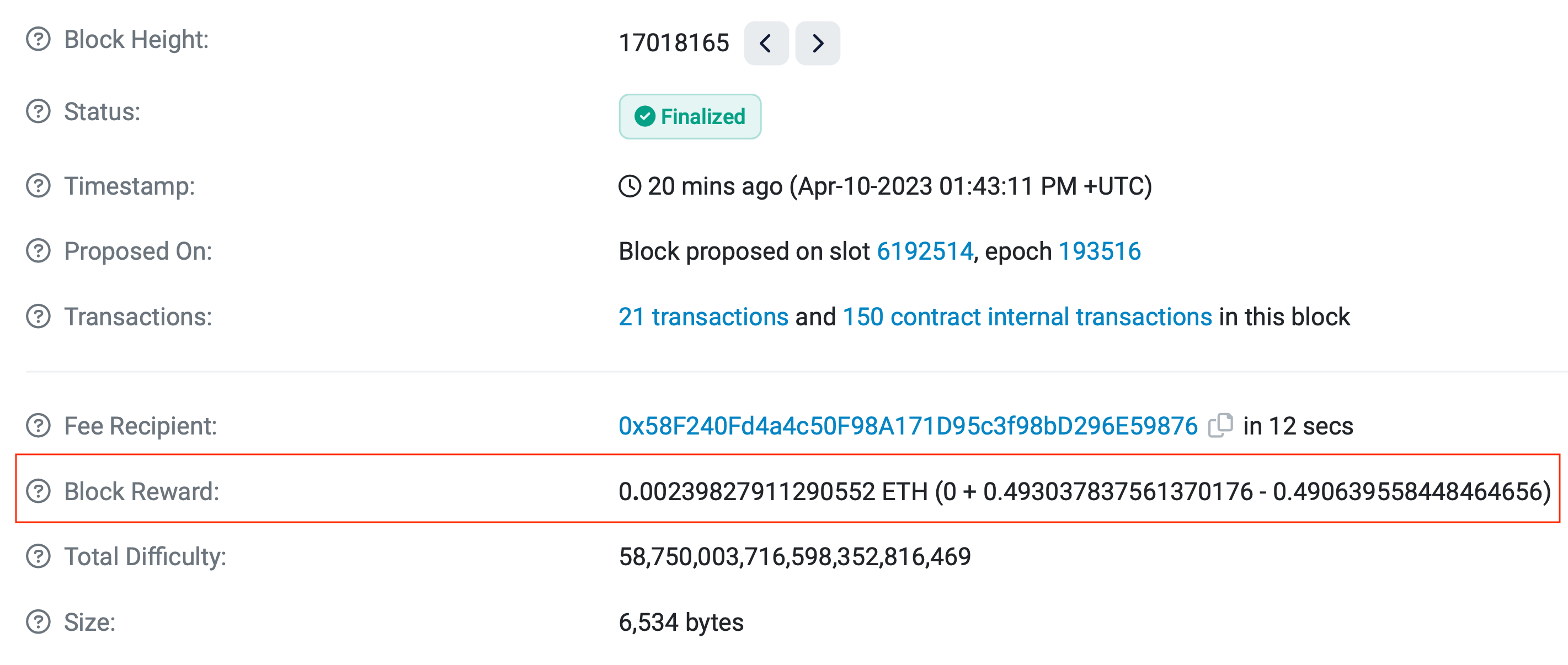 Вознаграждение в блоке сети Эфириума под номером 17018165