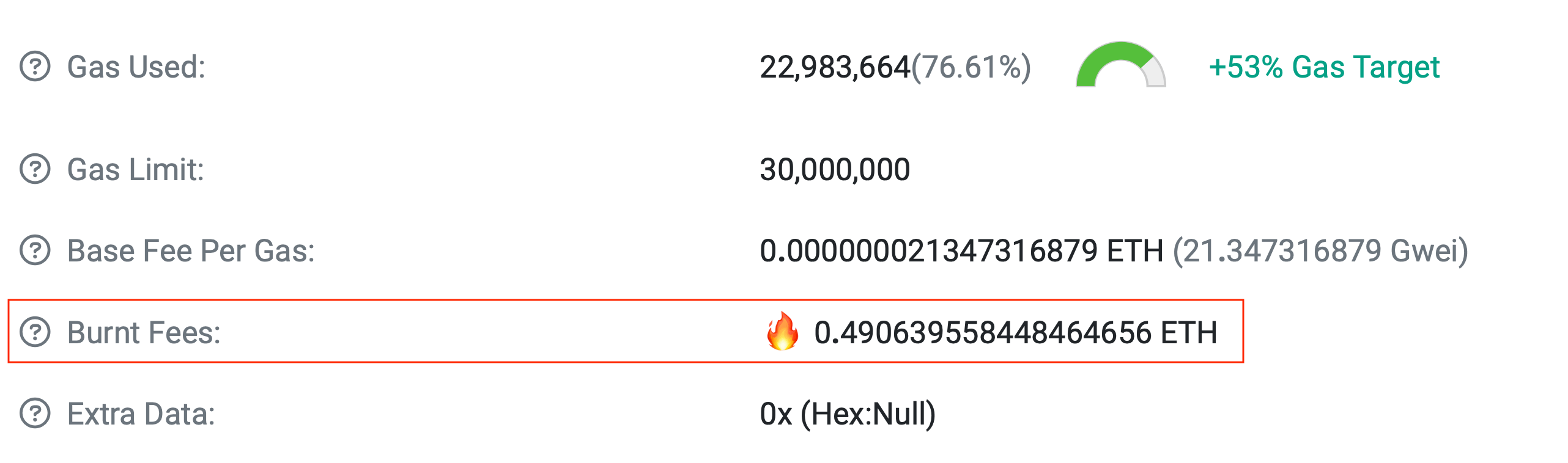 У Эфириума сейчас ситуация другая. Проведение каждой транзакции в сети криптовалюты заканчивается уничтожением определённого объёма ETH, используемого в качестве комиссий за проведение транзакций. В случае с уже упомянутым блоком 17018165 речь идёт о сжигании 0.49 ETH. Вот соответствующие данные.