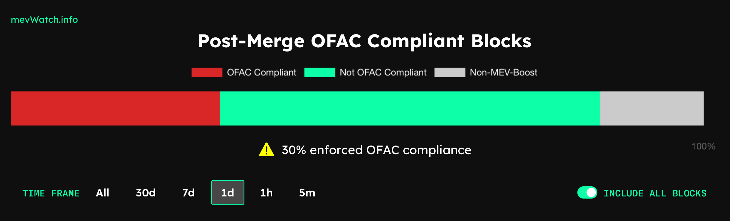По данным платформы MEV Watch, сегодня около 30 процентов валидаторов в сети Эфириума должны выполнять указания ведомства OFAC. А значит они обязательно проигнорируют транзакцию, связанную с тем же миксером Tornado Cash, и не включат её в свой блок.