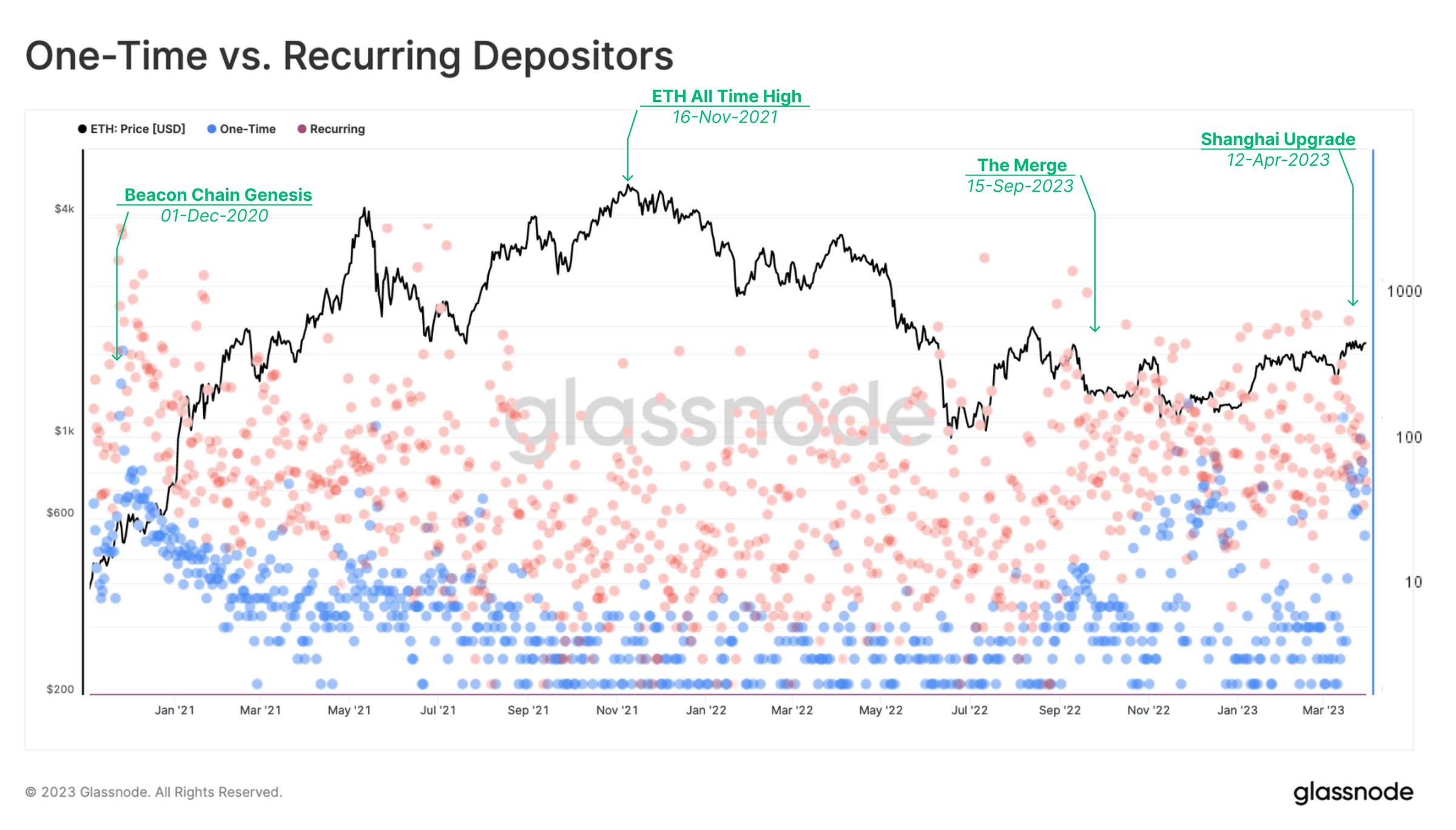 На графике ниже также показана активность единовременных и повторяющихся депозиторов. Первые вносили монеты в стейкинг один раз, вторые – как минимум несколько раз.