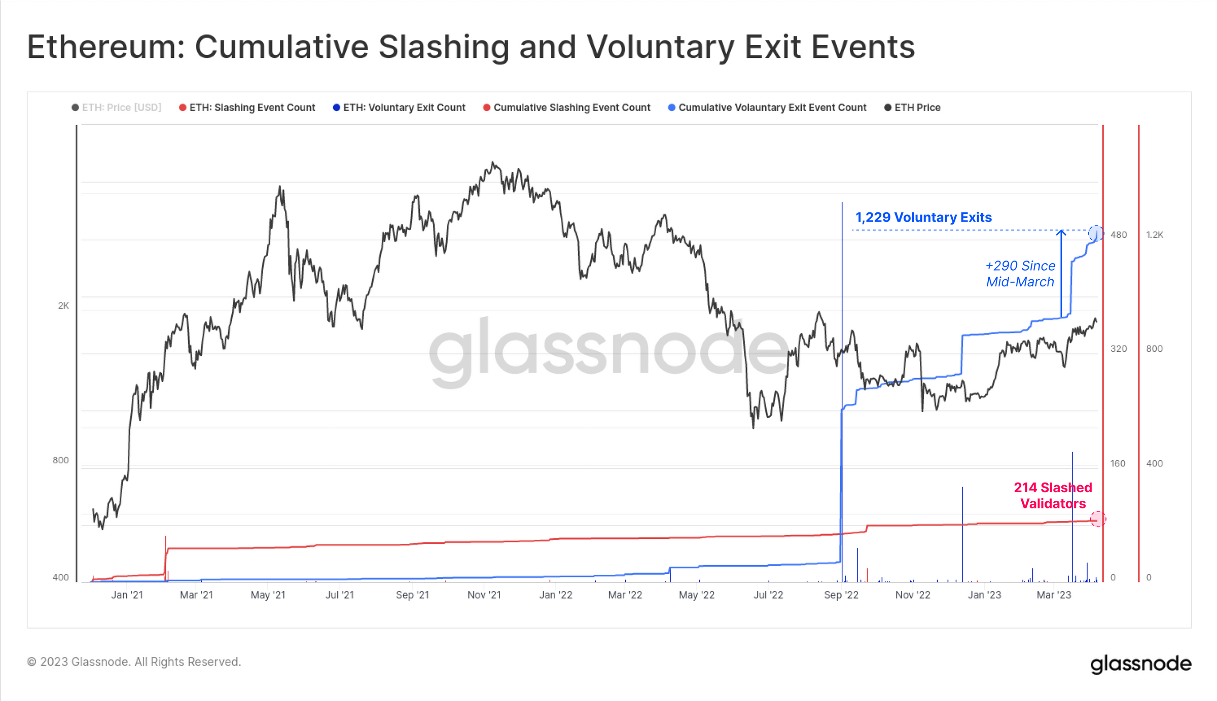 Депозиторы не могут быстро вывести ETH из стейкинга, однако они всё ещё могут подписать сообщение о добровольном выходе, чтобы дать понять сети о своём желании. В настоящее время 1229 валидаторов или 253 депозитора ожидают вывода средств. Есть ещё 214 валидаторов, которые будут «вытеснены», как только будет разрешено снятие средств. Последние – это недобросовестные участники процесса, которые нарушили условия стейкинга.
